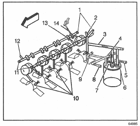 The oil flows from the oil filter or the oil filter bypass valve to the main oil galleries. An oil pressure sensor is located on the left main oil gallery. The oil flows from the main oil galleries to the camshaft bearing bores. The channel in the camshaft bearing bores supplies the oil to the camshaft bearings and to the main bearing oil galleries. The oil flows from the upper main bearing shells to the crankshaft oil galleries.