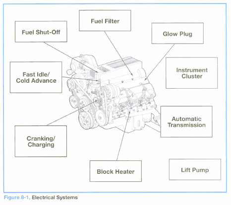 The electrical systems of the 6.5L V8 turbo diesel engine include the following groups of parts (refer to Figure 8-1):