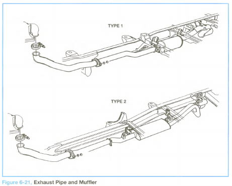 Exhaust gases exiting the turbocharger travel through a single pipe to the muffler (see Figure 6-21). A pipe carries exhaust gases from the muffler to the outside air. Hangers positioned in several locations have isolators made of composite material to dampen the transmission of noise and vibration from the exhaust system to the vehicle body.