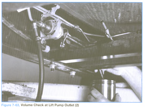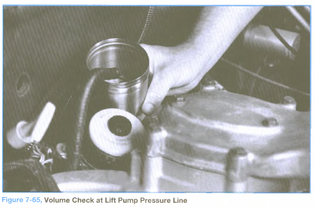 • If the volume is more than 0.24 liter (1/2 pint) in 15 seconds, check lift pump output pressure (part 3).
