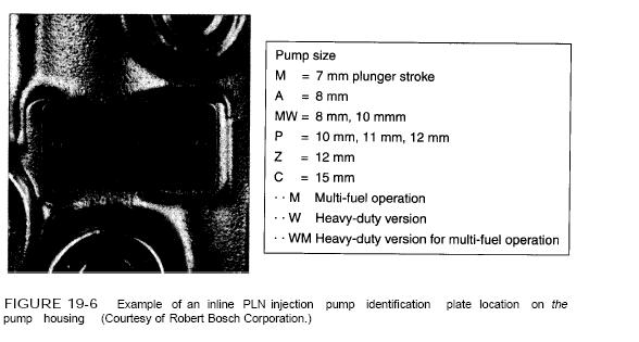 Inline pumps are referred to by their physical size, which relates to pumping plunger diameter, how much fuel they can deliver (quantity), and the pressure they can deliver to the nozzle. These pump sizes are M, A, MW, and P. Therefore, PES-A, PES-M, PES-MW, and PES-P indicate pumps with an enclosed camshaft of the size represented by the letter. Pump size examples are included in Figure 19-6.