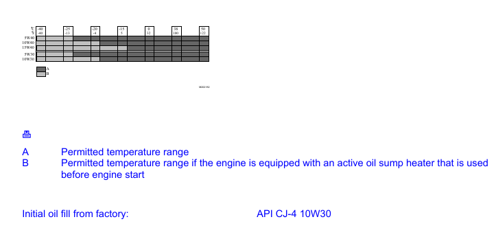 (2) The primary PACCAR recommendation is for the use of 10W30 multigrade lubricating oil for normal operation at ambient temperatures above -15°C [5°F]. For ambient temperatures below -15°C [5°F], SAE 5W30 may be used, provided it meets API CJ-4 oil specifications and biodiesel or biodiesel blended fuel is not used as fuel for the engine. Using a multigrade oil helps improve engine cranking in low temperature conditions, reduces deposit formation and increases engine durability.