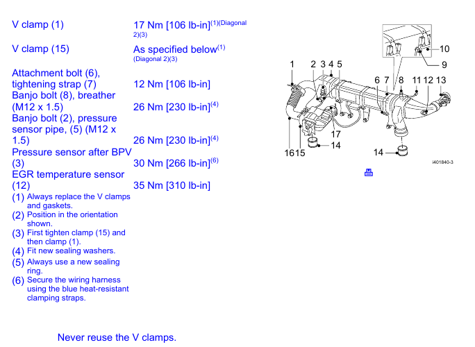 For V clamp (15), two different V clamps are used, and both require a different tightening torque.