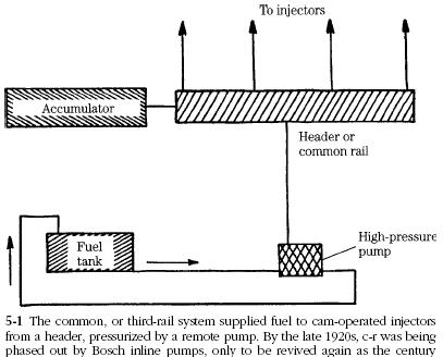 The need for more compact and silent submarine engines led the British arms maker Vickers to develop airless, or solid, injection. One can make the case that the ultimate consumers of nineteenth- and twentieth-century technology were enemy soldiers, sailors, and civilians. At any rate, solid injection was a vast improvement and, after the end of hostilities in 1919, was widely commercialized. Injectors fed from a common rail that was filled with high-pressure fuel and usually fitted with an accumulator to smooth pressure variations generated by injector opening and closing (Fig. 5-1). Adjustable wedges between the camshaft lobes and the injector followers permitted injection duration to vary with speed and load.